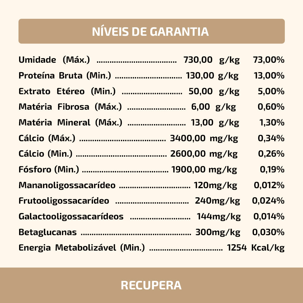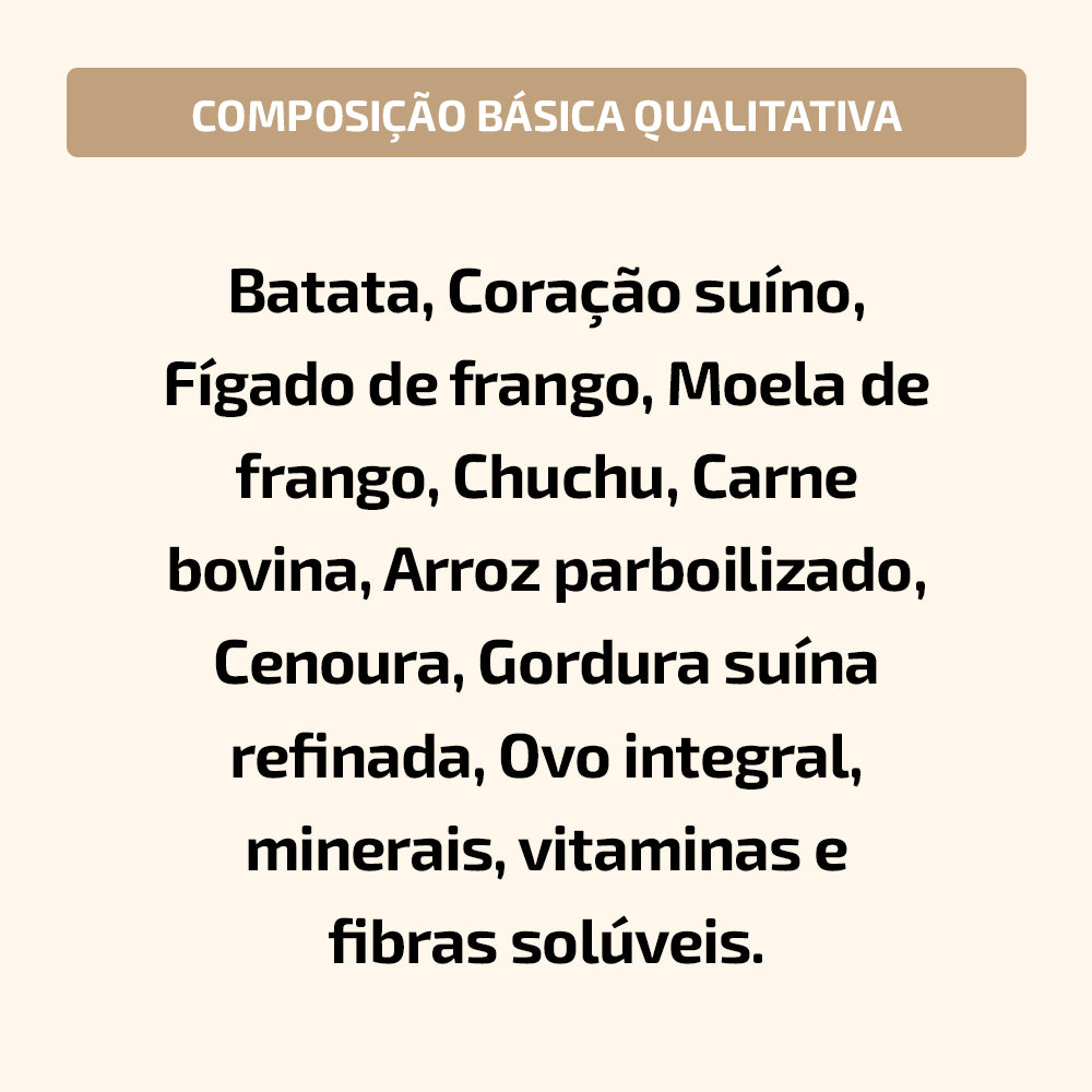 Batata inglesa, Lingua suína, Fígado de frango, Moela, Chuchu, Carne bovina, Arroz parboilizado, Cenoura, Gordura suÍna, Ovos, Fibras solúveis